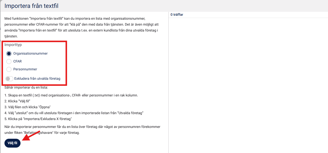 2. Klicka sedan på "välj fil" för att importera organisationsnummer, personnummer eller CFAR-nummer.
