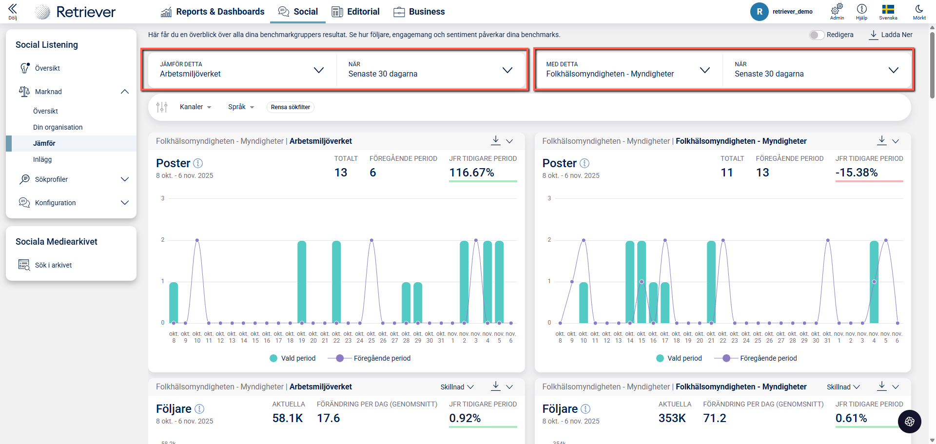 I Jämför kan du jämföra två olika konton, inom en vald kanal.