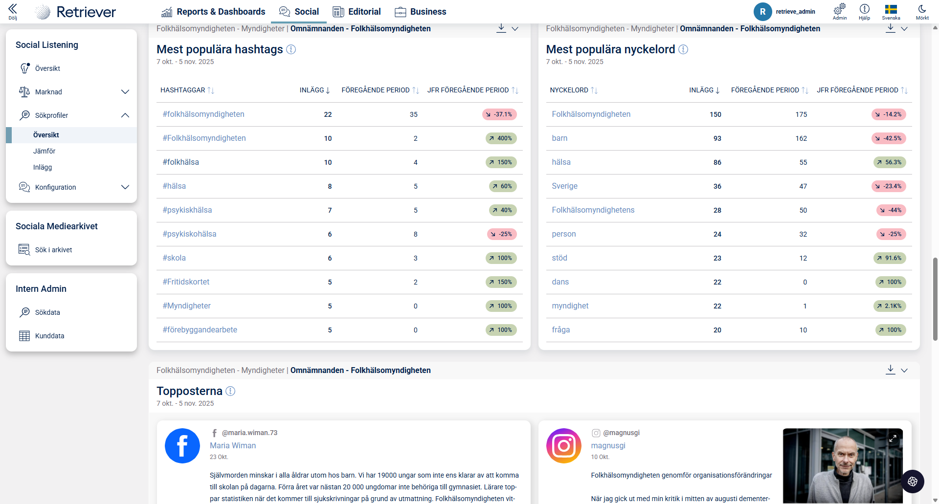 Förutom användbar statistik som engagemang och sentiment finner du även en översikt över de mest använda hashtagsen, nyckelord och populära inlägg.