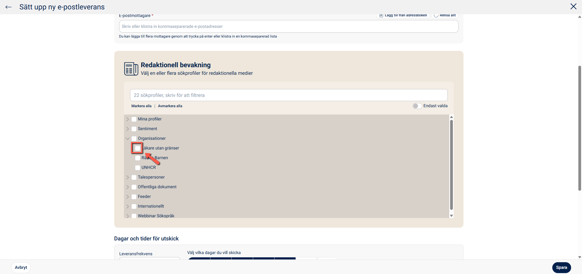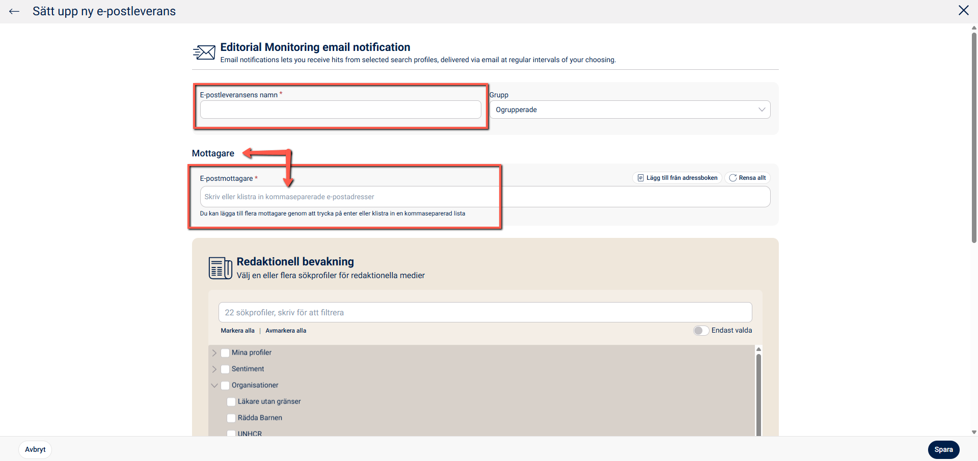 Har du ett specifikt redaktörs-inlogg har du möjlighet att se över och själv lägga till eller justera e-postmottagare av er löpande mediebevakning. Observera att det enbart är tillåtet att lägga till e-postadresser som går att knyta till er egen organisation.
