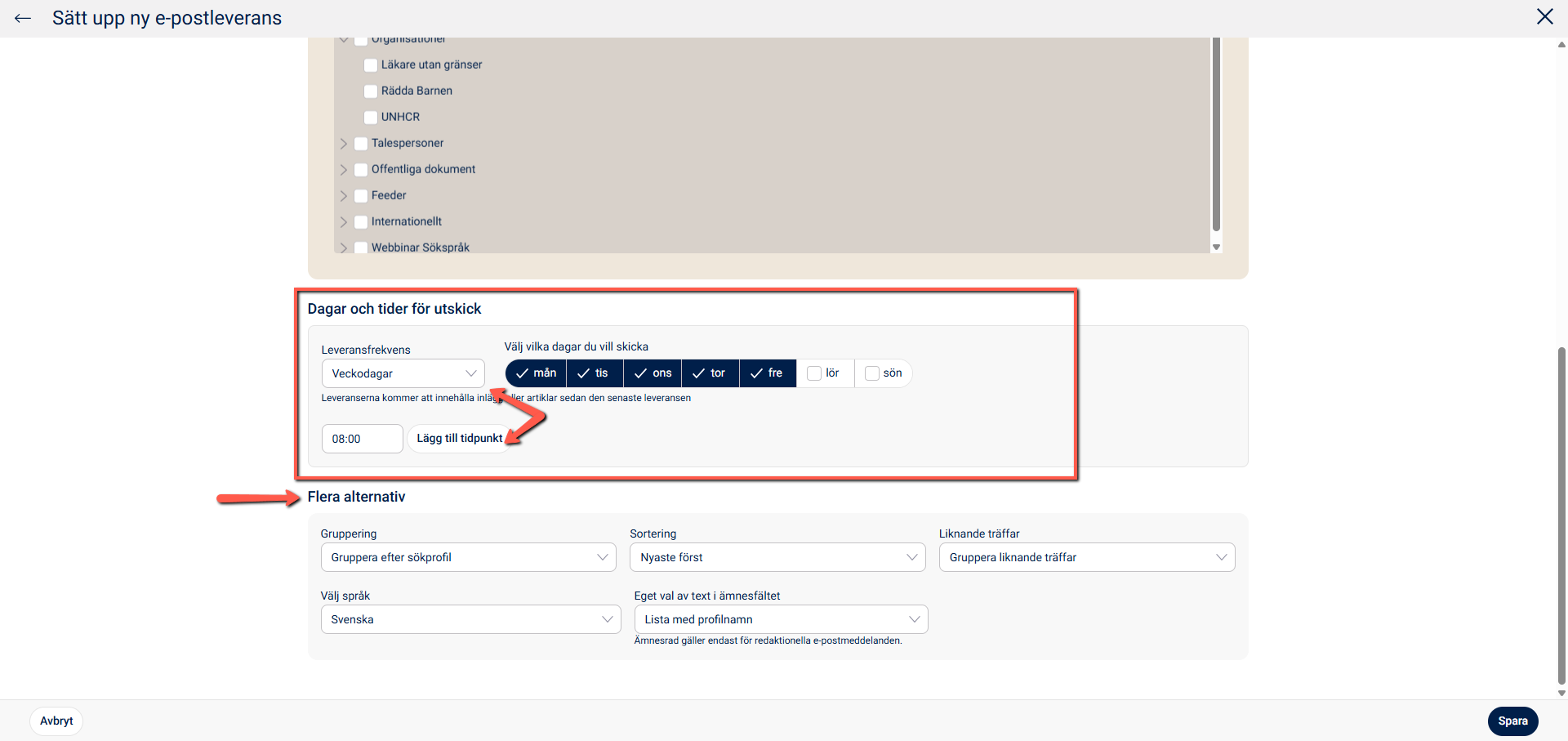 Välj sedan hur ofta ni vill ha utskicket. Ni kan välja en förinställd tidpunkt eller att göra den helt skräddarsydd för er. Vill ni skräddasy eran bevakning ytterligare kan ni kika på "Flera alternativ".