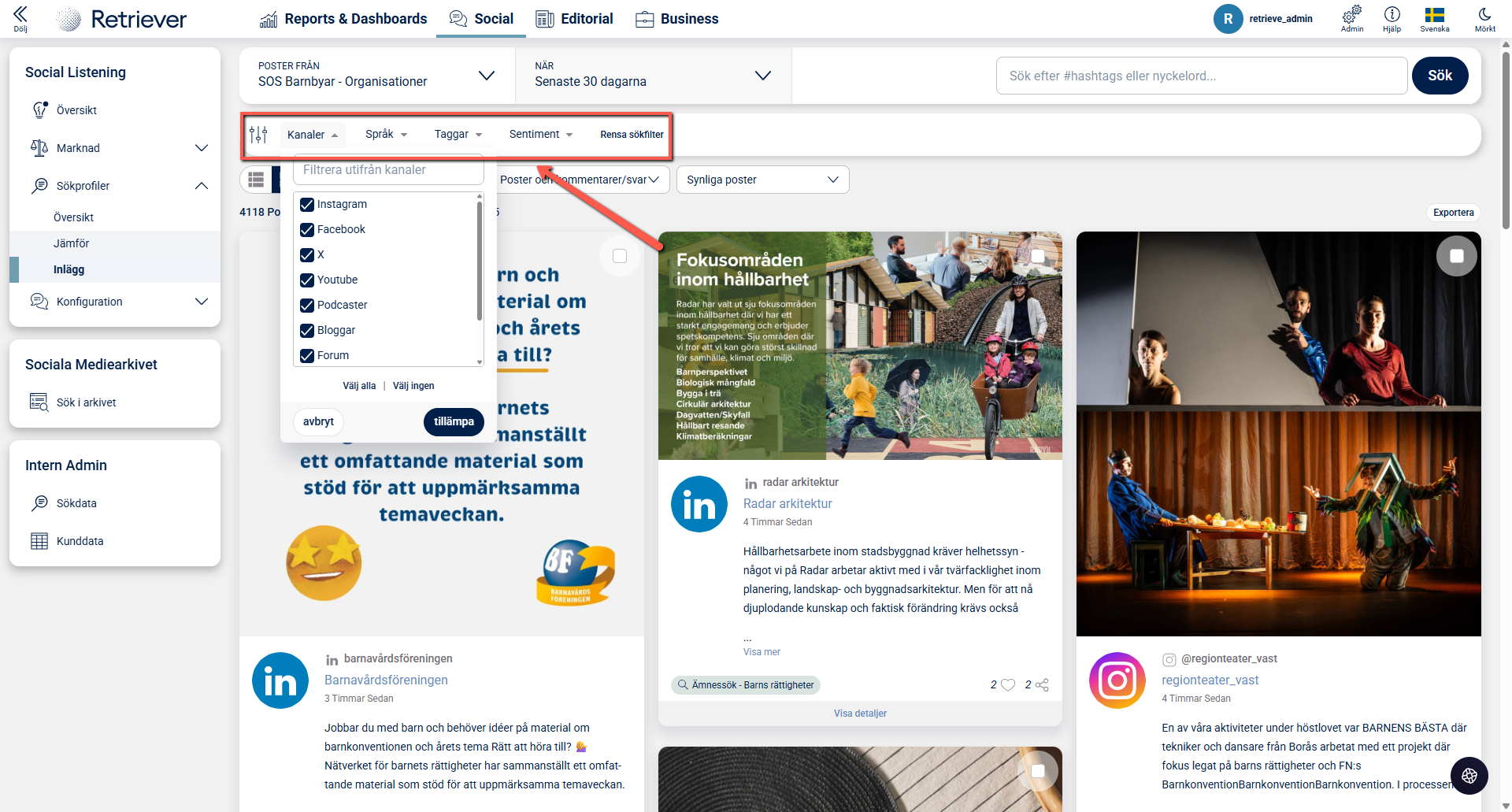 Du kan även filtrera utifrån kanaler, språk, taggar (Läs om hur du taggar inlägg här) samt sentiment