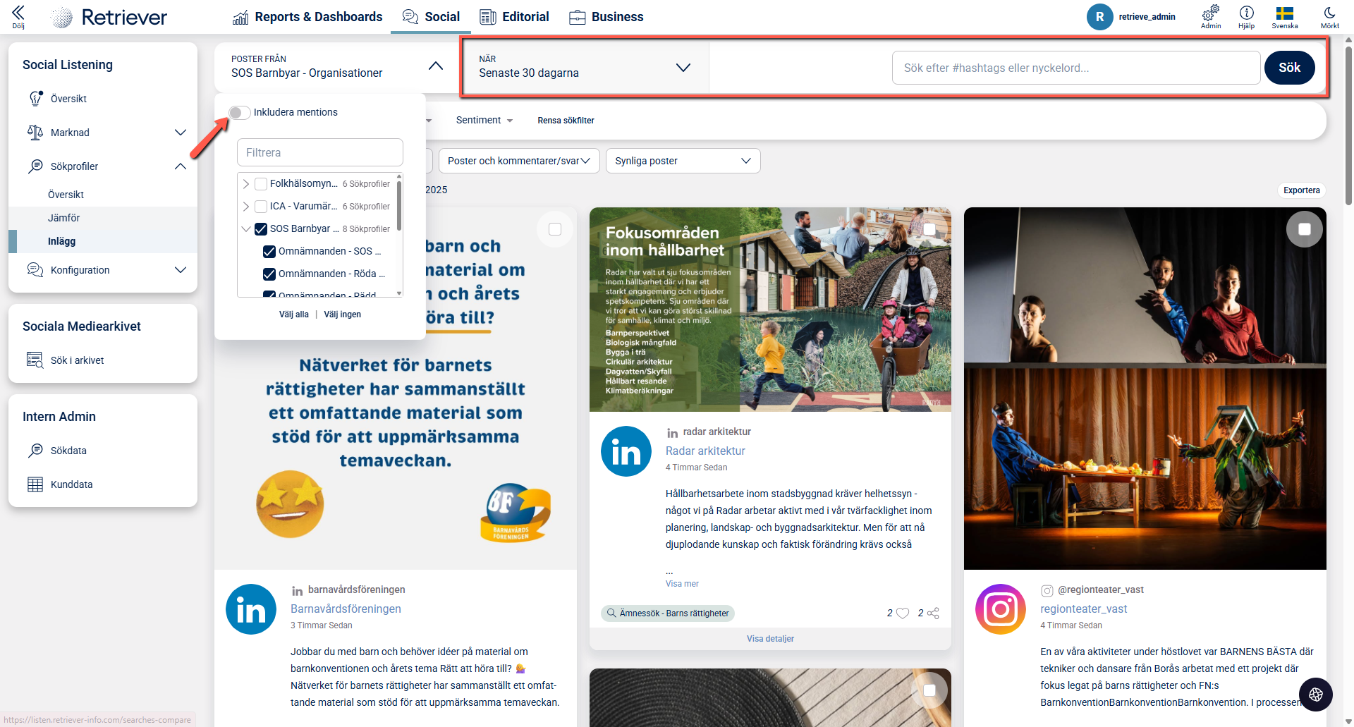 Välj att inkludera mentions, välj vilka datum du vill filtrera på eller sök efter #hashtags eller nyckelord.