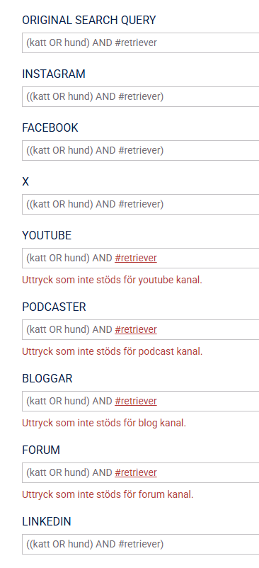 I exemplet nedan har sökningen (katt OR hund) AND #retriever resulterat i felmeddelanden för de kanaler där sökoperatorn # inte är tillgänglig:
