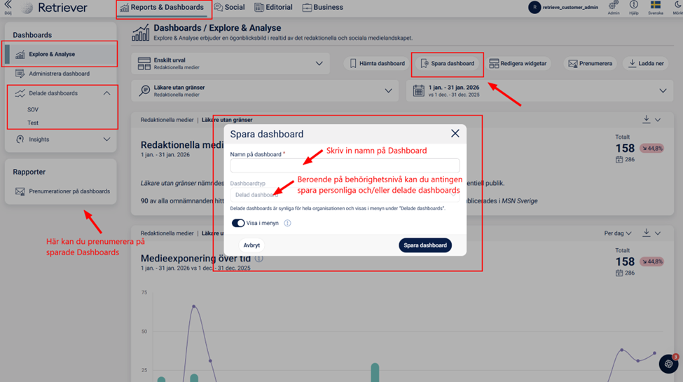 Möjligheten att spara dashboards och skapa prenumeration av dashboards beror på vilken behörighetsnivå du är inloggad med. Om du saknar denna funktion eller är osäker på vilken behörighet du har, är du varmt välkommen att kontakta oss på support@retriever.se.