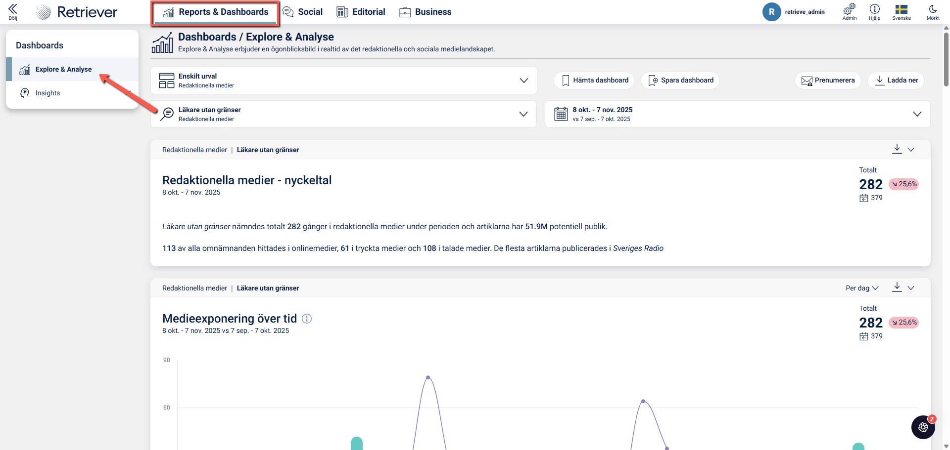 Verktyget Utforska & Analysera finns under rubriken Rapporter & Dashboards och är ett analysverktyg där du kan ta fram olika diagram av kvantitativ statistik och jämföra er samlade träffbild som genererats av de sökprofiler och sökord ni har upprättat för redaktionella- och sociala medier i verktygen Monitor (red.medier) och Listen (soc.medier).