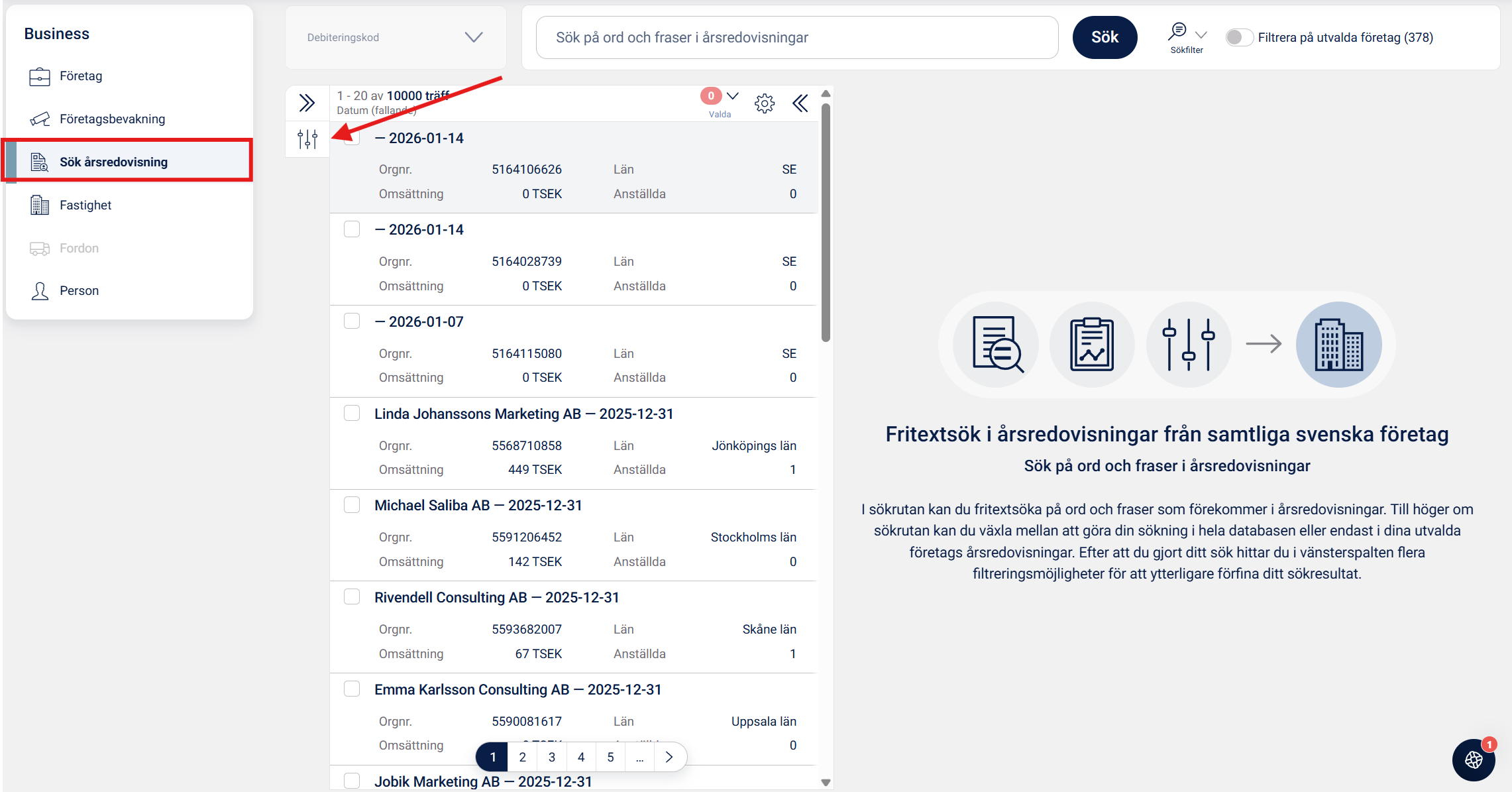 Du kan också filtrera fram årsredovisningar baserat på till exempel årtal eller omsättning genom att klicka fram filtret: