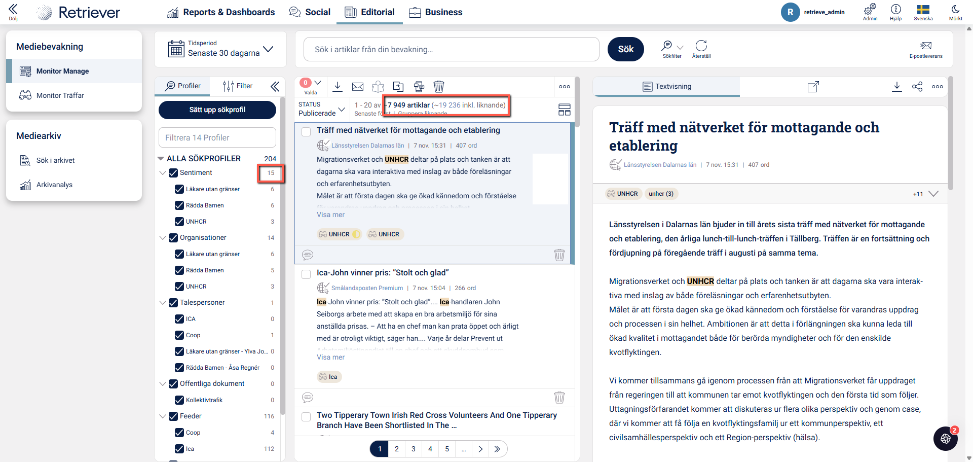 Det totala antalet träffar som hämtats under dagen visas bredvid varje sökprofil i vänsterspalten. Du kan också se det totala antalet träffar de senaste 30 dagarna längst upp i träfflistan i mitten (se bild). Önskar du se hela antalet artiklar i visnings-vyn i mitten klickar du på "Vy" och bockar ur "Gruppera liknande artiklar".