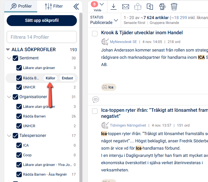 För att hitta vilka källor som ingår i din bevakning kan du hovra över profilen som du vill veta källistan för, tryck sedan på "Källor" som visat i bilden nedan.